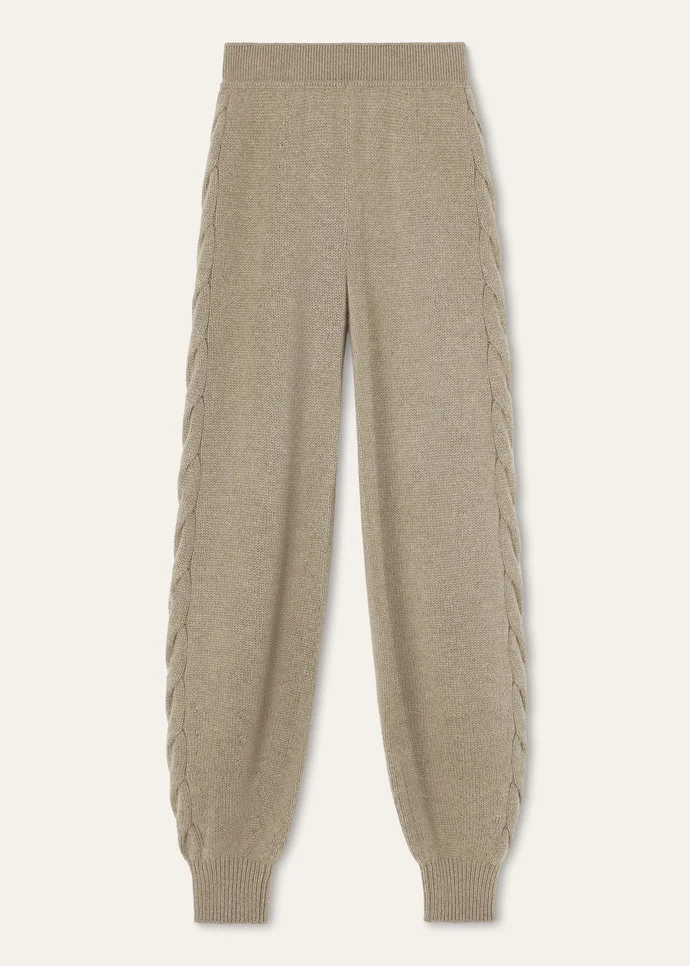 Spun from Baby Coarsehair using sumptuous Baby Cashmere yarns, the Napier pants are ideal for refined lounging. The fabric is worked to create an elegantly rustic look, yet it lends exceptional softness to the enveloping silhouette. A tonal cable runs down the side, echoing the defining features of the Napier knitwear line. Product details Ribbed waistband and cuffs Regular fit Gauge 5 Composition: 100% Baby Cashmere Made in Italy Product code: FAP6070