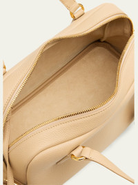 This Loro Piana "Needle" shoulder bag is crafted in fine-grained leather in a bowling bag-inspired silhouette Flat top handles, 5.1" drop Detachable, adjustable shoulder strap, 14.6" - 23.6" drop Can be worn as a top handle or shoulder bag Two-way zip top closure with padlock fastening Detachable keyring with padlock charm Interior, removable zip top pouch Lining: Suede Feet protect the bottom of the bag Approx. 6.3"H x 12.2"W x 6.3"D Wipe clean Made in Italy Online Inquiries: BGS21_V6N57| Store Inquiries: #5069161