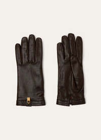 The Nora gloves reflect the rich heritage of Loro Piana, seamlessly pulling each look together with understated finesse. Subtle, hand-finished details enhance these extra-smooth goatskin gloves, from the clean, unadorned lines to the thin band accented with tonal stitching and delicate gold pendants. An inner slit at the wrist offers a comfortable fit and refined ease. Product details Lined with colored silk twill Antique gold loop and backing My Charms in Gold Sun finish Bezel and padlock feature an engraved logo on both sides Composition: 100% Lambskin Lining: 70% Cashmere, 30% Silk Made in Italy Product code: FAP1530