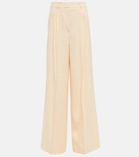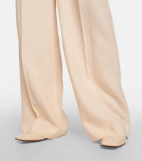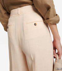 Loro Piana's Nyack pants are made from wool and linen. The elegant design has double front pleats, wide legs, and on-seam pockets. Product Details - Made in Italy - Material: 38% virgin wool, 62% linen - Closure: zipper fly, button fastening - Designer color name: Pink - Pockets: side slit pockets, back pockets - Care instructions: dry clean - Item number: P00774654 Size & Fit - Fits small to size - we recommend trying one size larger - Mid-weight material - Wide-leg - High-waisted - The model seen in the picture is 178cm-5'10" and wearing a size IT 42