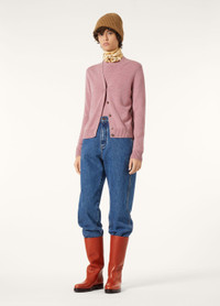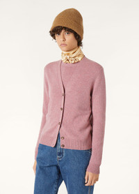 Gathered just once from each infant Hircus goat, Baby Cashmere embodies nature's fleeting perfection—a cloud-soft whisper of unparalleled luxury. A study in quiet sophistication, the regular-fit short cardigan crafted from this special yarn features a subtle V-neckline and clean, simple buttoning. Its minimalist design allows the beauty of the fabric and impeccable craftsmanship to take center stage. Product details V-neck collar Ribbed cuffs Long sleeves Button closure with horn buttons Regular fit Ribbed bottom Plain stitch Gauge 8 Composition: 100% Baby Cashmere Made in Italy Product code: FAP1736