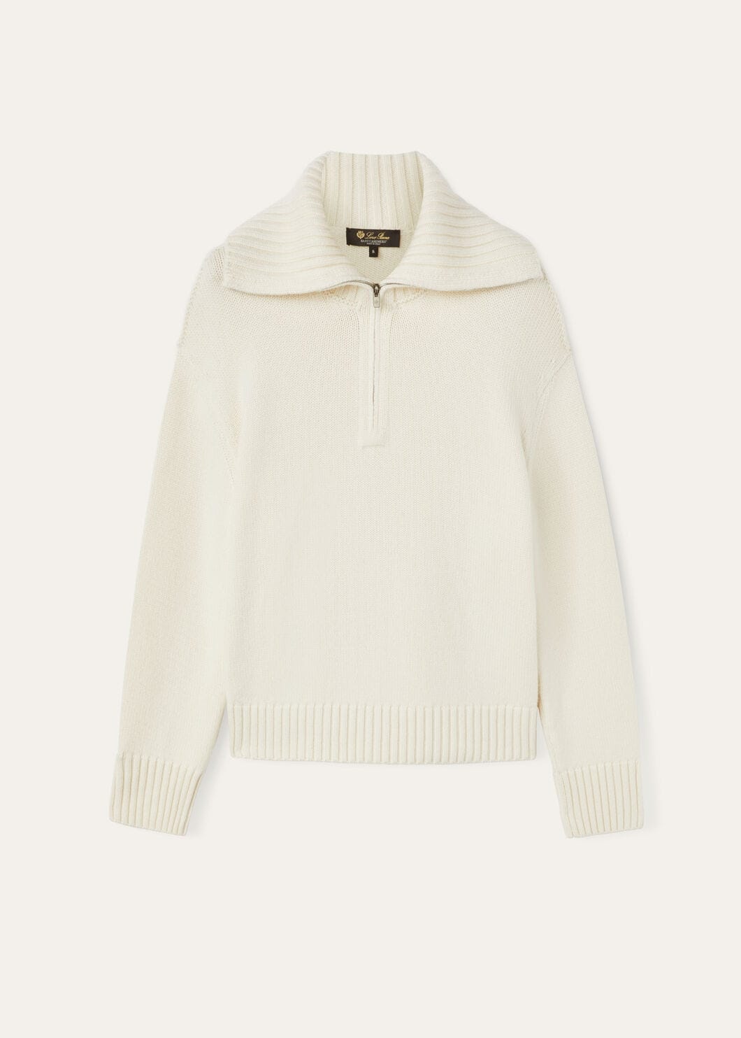 This lightweight, half-zip sweater is meticulously crafted from delicate, fine baby cashmere fibers using unique techniques, evoking Loro Piana’s artisanal expertise and the surreal peacefulness of New Zealand’s limitless horizons. It can be worn anywhere, thanks to a versatile, comfortable, boxy cut. Product details Wide, rounded neckline Set-in sleeves Ribbed collar, cuffs and hem Composition: 100% Baby Cashmere Model wears an IT L Model measures: height 5′ 11″/ 181cm, bust 33.5″/ 85cm, waist 25.6″/ 65cm, hips 36.6″/ 93cm. Made in Italy Product code: FAN3805