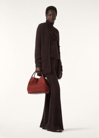 Defined by their fluid fabrication, these Peruvian Lily pants are shaped in a graceful flare. They are rendered in gossamer-light silk fused with sumptuous cashmere, providing subtle sheen and a soft touch. A ribbed waistband lends a final note of structured polish. Product details High-rise waist Flared cut Elasticated ribbed waistband Fuzzy texture Unlined Slim fit Gauge 5 Composition: 58% Silk, 42% Cashmere Made in Italy Product code: FAQ0684