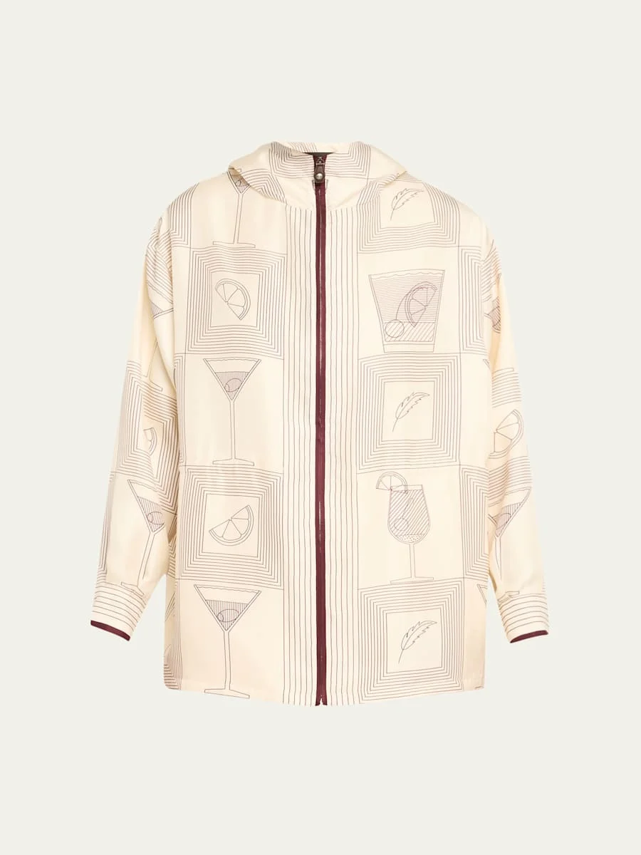 Loro Piana "Rafael" bomber jacket in Apertibo twill with a cocktail retro print Hooded neckline; zip front Long sleeves; button cuffs Side slip pockets Straight fit Hem falls below the hip Silk Dry clean Made in Italy Proposition 65 warning for California residents Online Inquiries: BGS21_BA4AB| Store Inquiries: #5030943