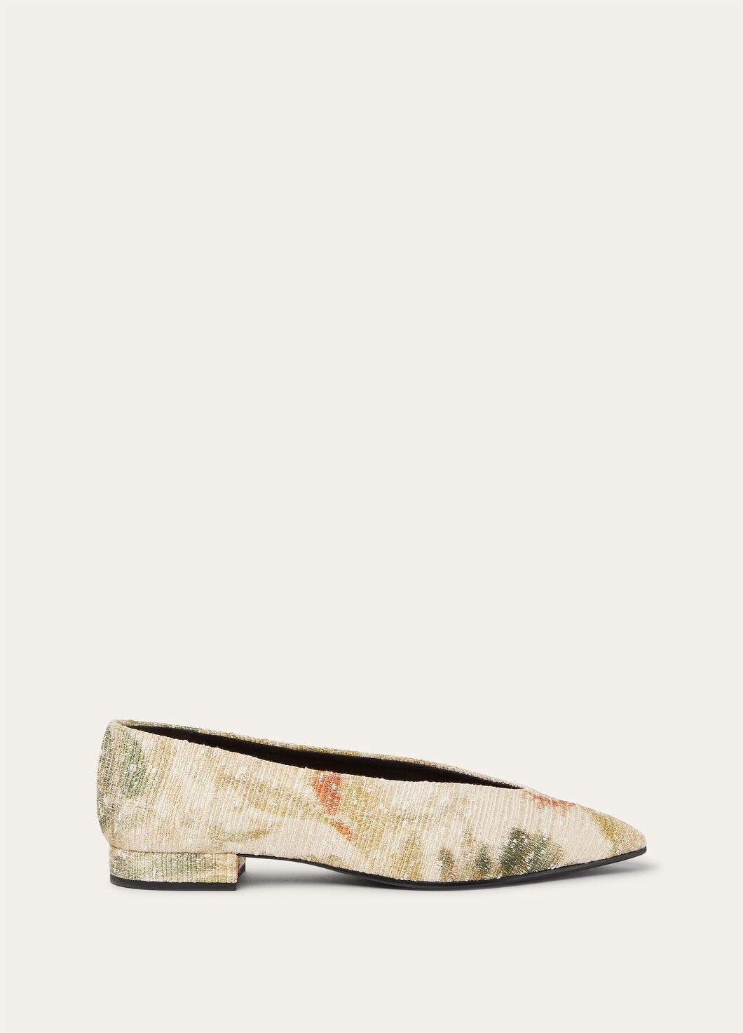 The ideal accent to the silhouette, the Rebecca ballet flats are elegant in shape and fabrication. Complete with a gently rounded, tapered toe, they have an elongated profile rendered in Giardino Knubby Chine – a bespoke fabric infused with cotton and touches of precious silk, worked for a delicate contrast between textured and smooth. The exclusive blend is decorated with the Maison’s linen-inspired chine print in spring-like pastel hues, for a touch of freshness. Product details Suede lining 2 cm same-fabric heel Composition: 53% Cotton, 24% Silk, 15% Acrylic, 8% Microfiber Model wears an IT 40 Model measures: height 5′ 10″/ 179cm, bust 30.3″/ 77cm, waist 23.2″/ 59cm, hips 35.0″/ 89cm, shoes 15.4″/ 39cm. Product code: FAP4583
