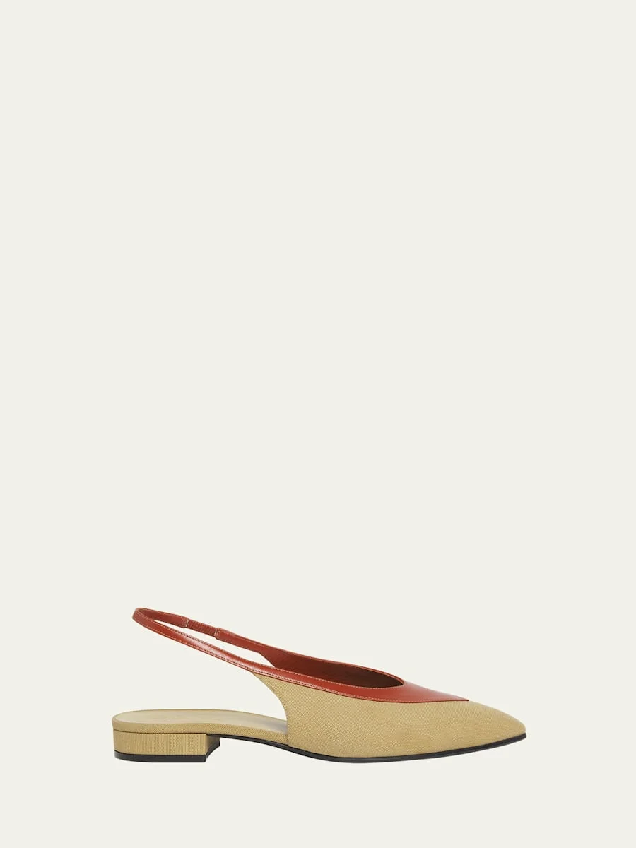Loro Piana "Rebecca" twotone canvas and leather ballerina flats 0.25 in / 10 mm flat heel Pointed toe Stretch slingback strap Leather outsole Lining: Leather Wipe clean Made in Italy
