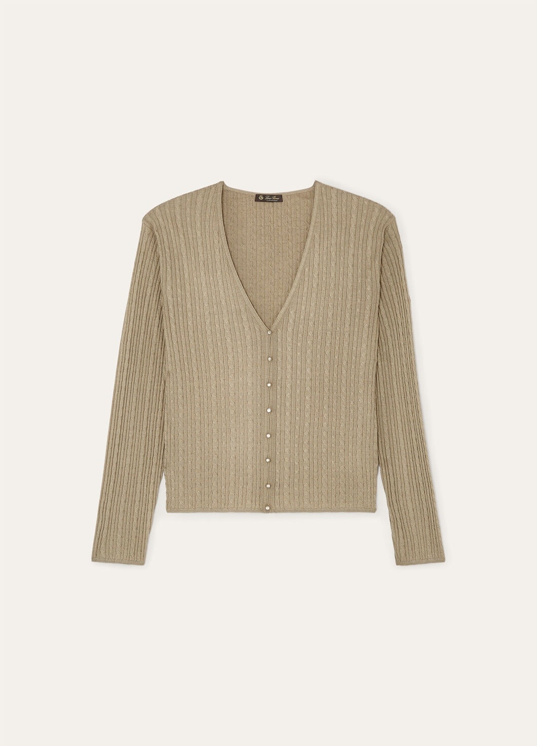 In a delicate dance of softness and strength, the Rimella cardigan combines the finest materials with intricate craftsmanship. A study in understated elegance, this attractive compact cardigan has a sleek fitted cut and V-neckline, while the cable pattern adds a touch of textural interest to the light consistency of the cashmere and silk yarn. Small mother-of-pearl buttons lend a subtle yet distinctive accent. Product details Ribbed hem, cuffs and placket Fastens at the front with mother-of-pearl buttons Composition: 70% Cashmere, 30% Silk Model wears an IT 40 Model measures: height 5′ 10″/ 178cm, bust 33.5″/ 85cm, waist 24.8″/ 63cm, hips 35.8″/ 91cm, shoes 15.4″/ 39cm. Made in Italy Product code: FAO2876