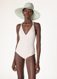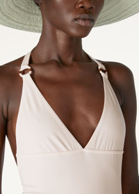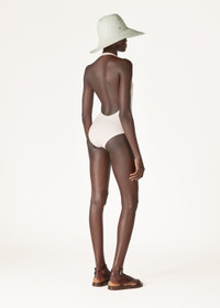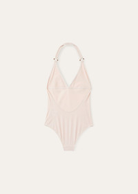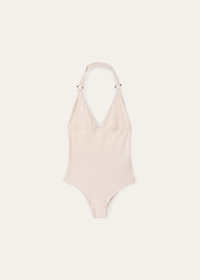 Crafted from microfiber jersey, this racing-style, one-piece swimsuit is defined by a low-cut leg and open back. The compact, high-performance fabric is durable and resistant; it perfectly clings to the body, guaranteeing a comfortable fit. The shoulder straps feature an enameled-metal ring in the shape of a life preserver — one of the collection’s main themes. Product details Enameled metal eyelet in the shape of a life preserver sewn on the lower left Halter Neck Composition: 62% Technical Fabric, 38% Elastane Model wears an IT 38 Model measures: height 5' 10.9"/ 180cm, bust 32.3"/ 82cm, waist 23.6"/ 60cm, hips 35.4"/ 90cm. Made in Italy Product Code: FAM9330