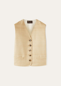 Classic comfort meets timeless style, honoring a century of elegance in every thread. Exquisite raw silk flows through this sleeveless waistcoat, its rich texture and subtle sheen lending an air of understated luxury. The V-neckline draws the eye inwards, where exclusive 'Sergio' horn buttons provide an elegant closure. Product details Rear pockets closed by Sergio buttons in refined horn in different shapes The new buttons are slightly thicker with a more rounded base to make them easier to fasten Pockets lined in silk Composition: 100% Silk Front Lining: 100% Linen Model wears an IT 36 Model measures: height 5′ 10″/ 179cm, bust 32.3″/ 82cm, waist 23.6″/ 60cm, hips 34.6″/ 88cm. Made in Italy Product code: FAO4024