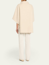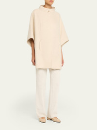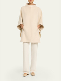 Iconic cape in cashmere double styled with a classic cut. Below hip length. It can be worn with the plonge leather belt to highlight the waist, or without for a softer, more flowing line. Elegant and versatile, ideal with formal looks Loro Piana "Salzburg" double-face cashmere jacket. Approx. measurements: 17"W x 69"L Stand collar; hidden snap front. Half sleeves. Leather belt cinches waist. Side-entry pockets. Relaxed silhouette. Clean only at cleaners specialized in treating leather. Do not iron. Made in Italy. Online Inquiries: BGS21_D2V4U| Store Inquiries: #2153907