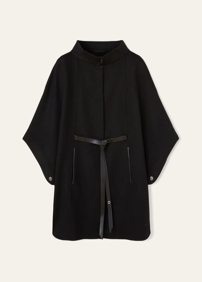 Iconic cape in cashmere double styled with a classic cut. Below hip length. It can be worn with the plonge leather belt to highlight the waist, or without for a softer, more flowing line. Elegant and versatile, ideal with formal looks. Product details Structured funnel neckline Fastens with press studs Press studs at the sides Hidden belt loops set into the seams Composition: 100% cashmere Trim: 100% lambskin Made in Italy Product code: FAG3753