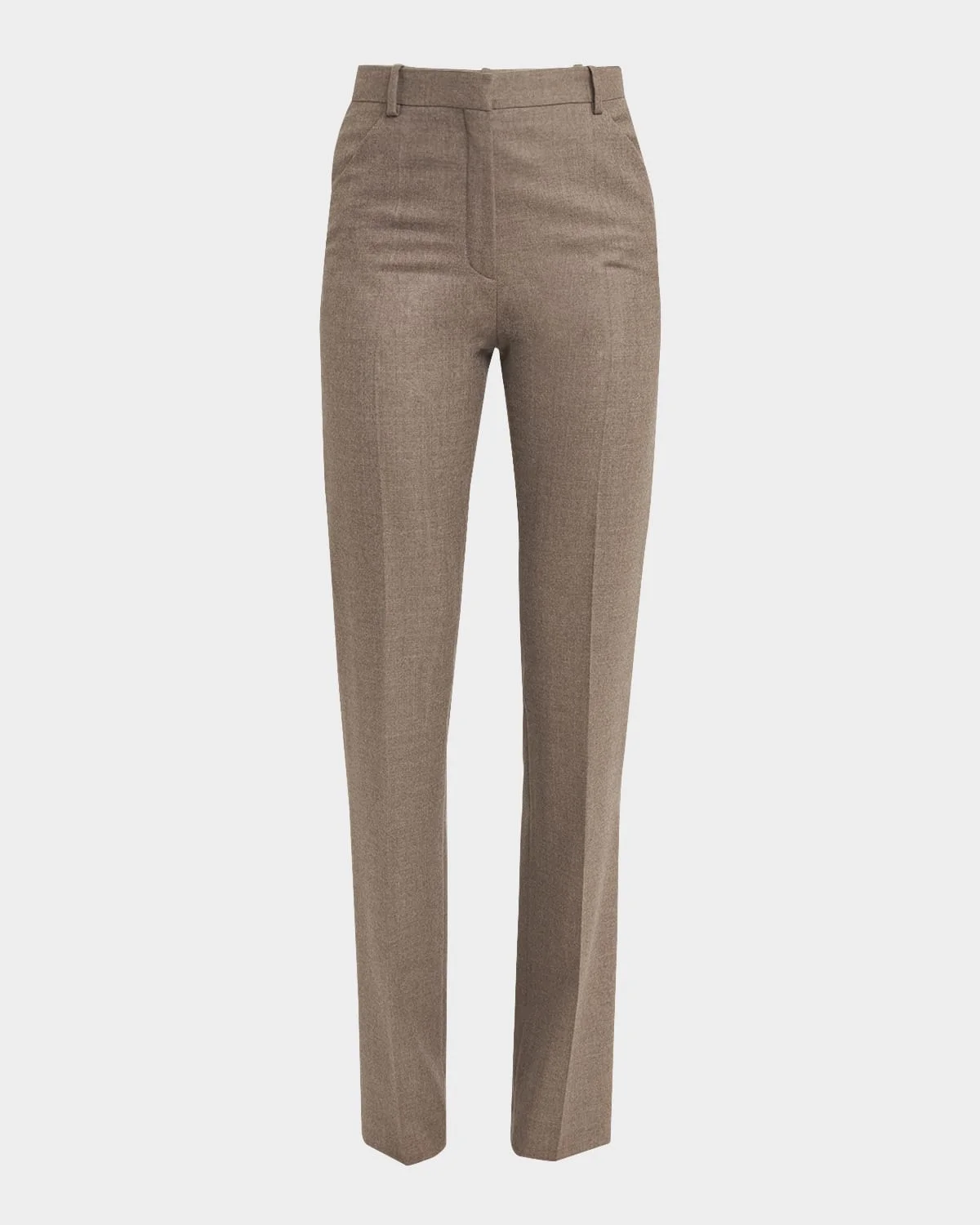 Loro Piana "Sawyer" trousers in wool High rise Angled side slip pockets Full length Straight legs Hook/zip fly; belt loops Virgin wool Made in Italy