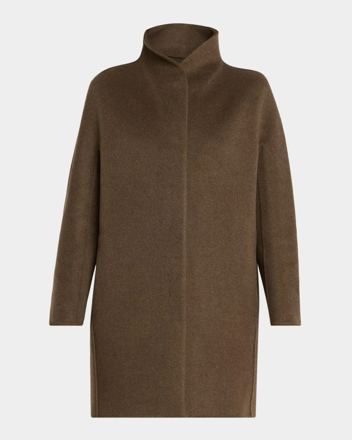 Loro Piana "Scotty" coat is crafted of a warm brushed cashmere Stand collar; singlebreasted front Long sleeves Side split pockets Straight fit Hem falls below the hip Concealed snapbutton closure Cashmere Trim: Leather Made in Italy