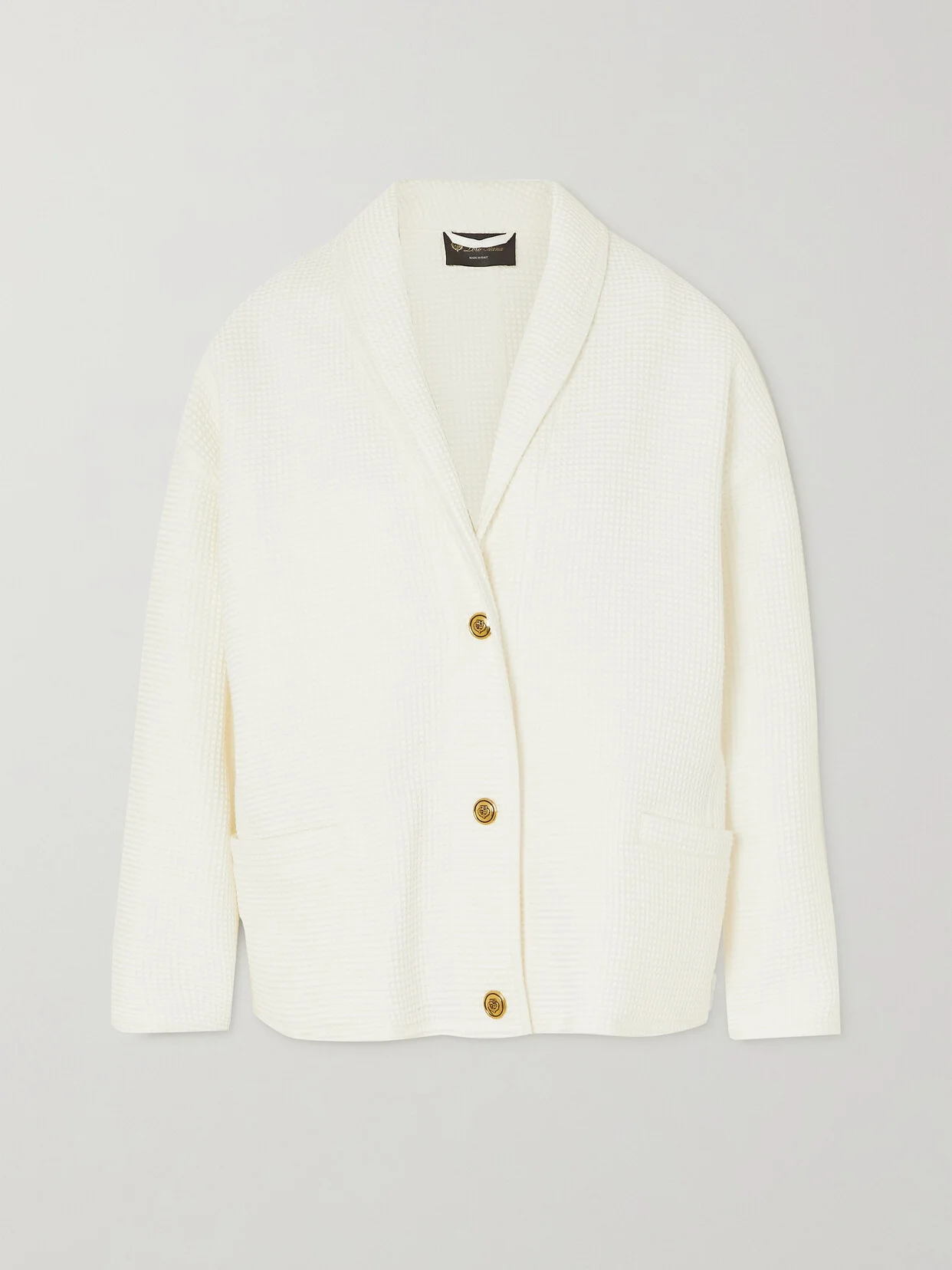 Loro Piana's 'Shana' cardigan is inspired by "the pristine nature of Italy's Aeolian Islands." It's made from tactile waffle-knit cotton that's beautifully light and has a shawl collar, dropped shoulders and loose kimono sleeves. Match your jewelry to the burnished gold-tone buttons.