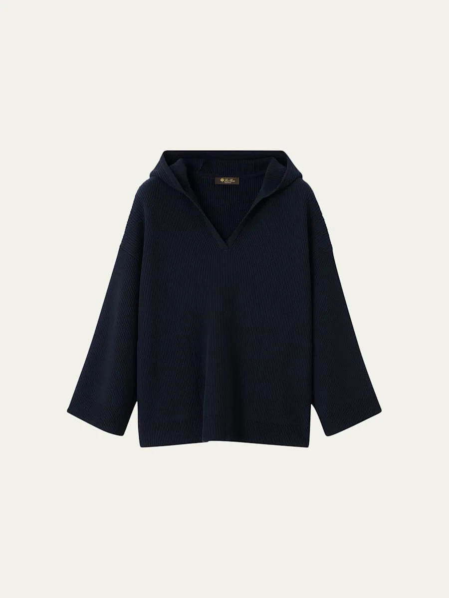 Knit from virgin wool, the "Sloop" pullover by Loro Piana features textural ribbing Hooded V neckline Dropped shoulders Relaxed long sleeves Mini side slits Oversized fit Pullover style Virgin wool Lining: Cupro Dry clean Made in Italy