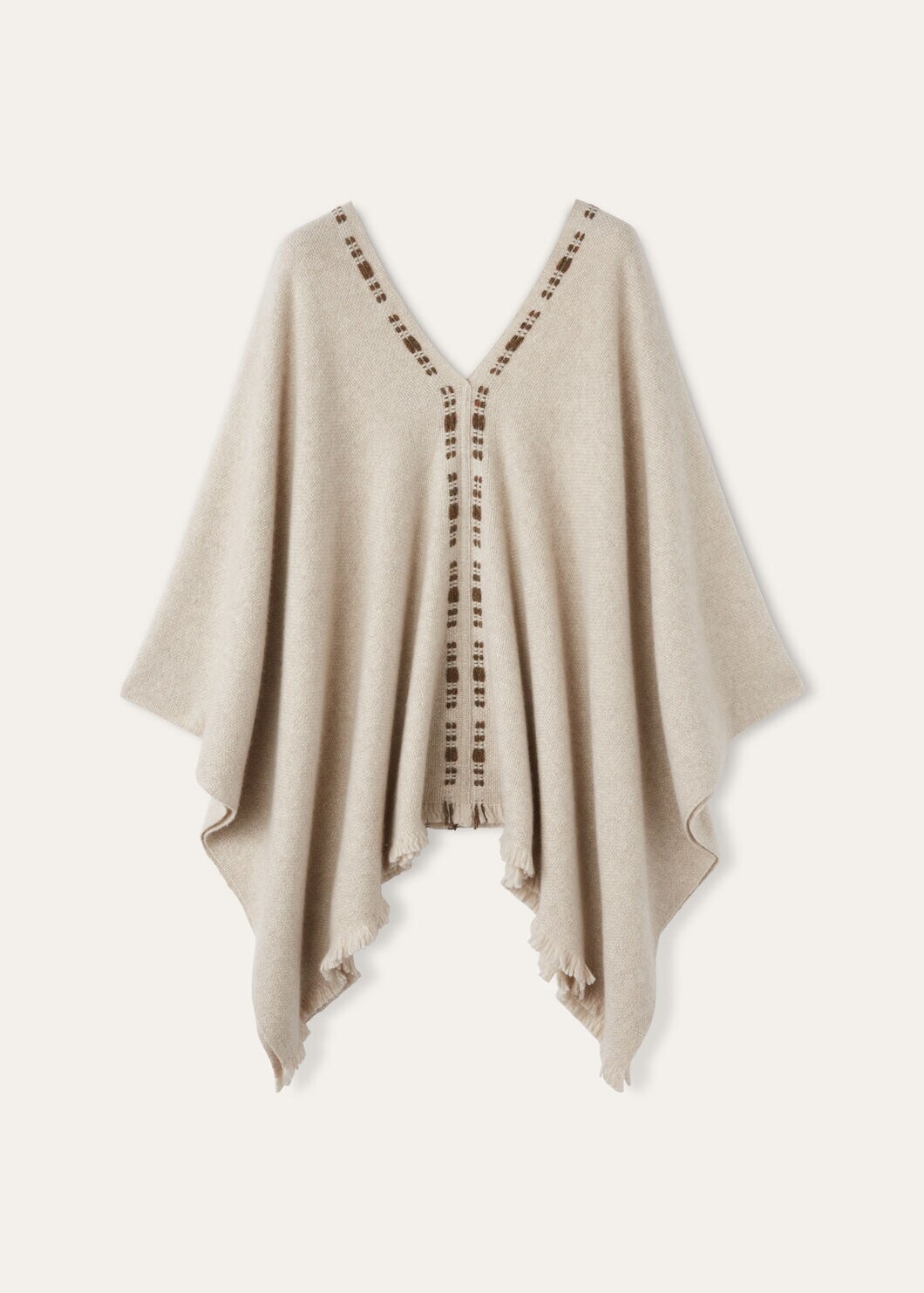 Weave peace and tranquility into your ensemble with the silk and cashmere poncho. Fashioned by joining two stoles along the long sides to create a slight overlap, this lightweight cape wraps you in an enveloping embrace. A contrasting insert of Cashmere Coarsehair® yarn runs the length of both the front and back, offering a distinctive and sophisticated outerwear option for your wardrobe. Product details Fringe trim at base Composition: 86% Cashmere, 14% Silk Specific Details: 100% Cashmere Made in Italy Product Code: FAO1051
