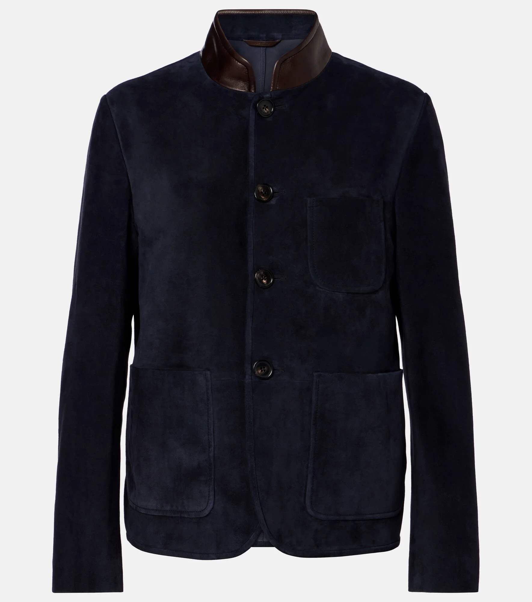 Every Loro Piana design combines the best of Italian craftsmanship with the finest raw materials. The brand's iconic Spagna jacket is reimagined in a mini silhouette from suede with leather trims. Product Details - Material: 100% calf leather - Care instructions: specialist clean - Made in Italy - Color: blue - Designer color name: Blue Navy - Lining: 100% silk - Details: 100% lamb leather - Pockets: patch pockets - Item number: P01130426 Size & Fit - True to size - Designed for a loose fit - Non-stretchy fabric - Falls to the hip - The model seen in the picture is 178cm-5'10" and wearing a size IT 40