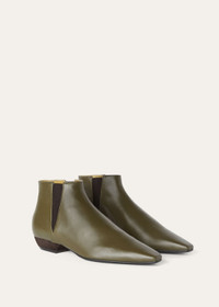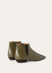 The epitome of casual luxury, this pointy toe soft calfskin boot has an exceptionally supple, slightly 'lived-in' feel that channels relaxed elegance. Elastic side gussets ensure an easy fit, complemented by a suede-covered heel for textural depth. The perfect accompaniment to sophisticated day and evening ensembles. Product details Natural color calfskin Side elastic in a contrasting shade Heel covered in suede Black heel cap Black sole Heel height: 2 cm (0.8 in) Composition: Upper: 100% Calfskin Lining: 100% Calfskin Sole: 100% Leather Specific Features: 100% Suede Product code: FAN8990