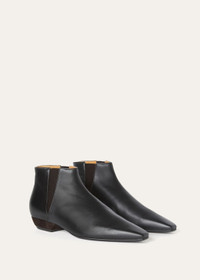 The epitome of casual luxury, this pointy toe soft calfskin boot has an exceptionally supple, slightly 'lived-in' feel that channels relaxed elegance. Elastic side gussets ensure an easy fit, complemented by a suede-covered heel for textural depth. The perfect accompaniment to sophisticated day and evening ensembles. Product details Natural color calfskin Side elastic in a contrasting shade Heel covered in suede Black heel cap Black sole Heel height: 2 cm (0.8 in) Composition: Upper: 100% Calfskin Lining: 100% Calfskin Sole: 100% Leather Specific Features: 100% Suede Product code: FAN8990