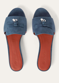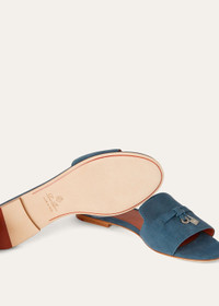 Suede sandal accessorised with a band featuring Loro Piana's My Charms, edged with tonal stitching. Refined, feminine footwear, perfect both in the city and on holiday. Product details Leather treated with a water-repellent, stain-resistant finish Lightly cushioned footbed Light-coloured sole in buffed leather with kummel-coloured stripe Composition: 100% suede goatskin Trim: lining 100% kidskin Made in Italy Product code: FAI5580