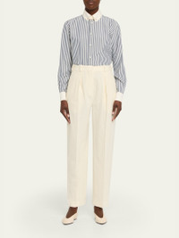 Loro Piana "Thea" shirt elevates classic tailoring with a striped woven silk, contrast collar and cuffs, and a gold-tone collar pin for a polished finish Rounded collar; button front Long sleeves; French cuffs Yoked back; box pleat Relaxed fit Shirttail hem Silk Dry clean Made in Italy Online Inquiries: BGS21_BB0NV| Store Inquiries: #5400098