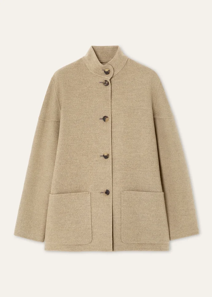 Classic tailoring codes and a sense of relaxed ease come together in the Tod jacket, shaped in a generous design with a standing collar. It is rendered in Cashmere Double – whereby two layers of pure cashmere are meticulously hand-joined using a double construction technique for a supremely soft feel and unlined finish. Across the back, a precisely placed yoke seam aligns with the dropped-shoulder construction for a clean, precise finish. Product details Standing collar Oversized patch front pockets Horn button fastening Straight hem Unlined Oversized fit Composition: 100% Cashmere Made in Italy Product code: FAP6988