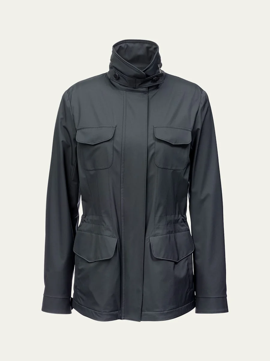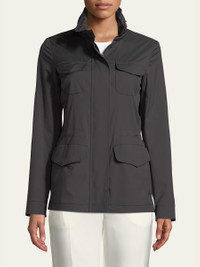 Loro Piana "Traveler" jacket in lightweight, creaseresistant Windmate® microfiber and cashmere blend. Storm System® treatment for a waterproof, windresistant finish. Approx. 26.8"L from shoulder to hem. Spread collar with packable drawstring hood. Zip front with concealed snapover placket. Internal drawstring waist. Four front flap pockets. Nylon; lining, cashmere. Dry clean. Made in Italy.