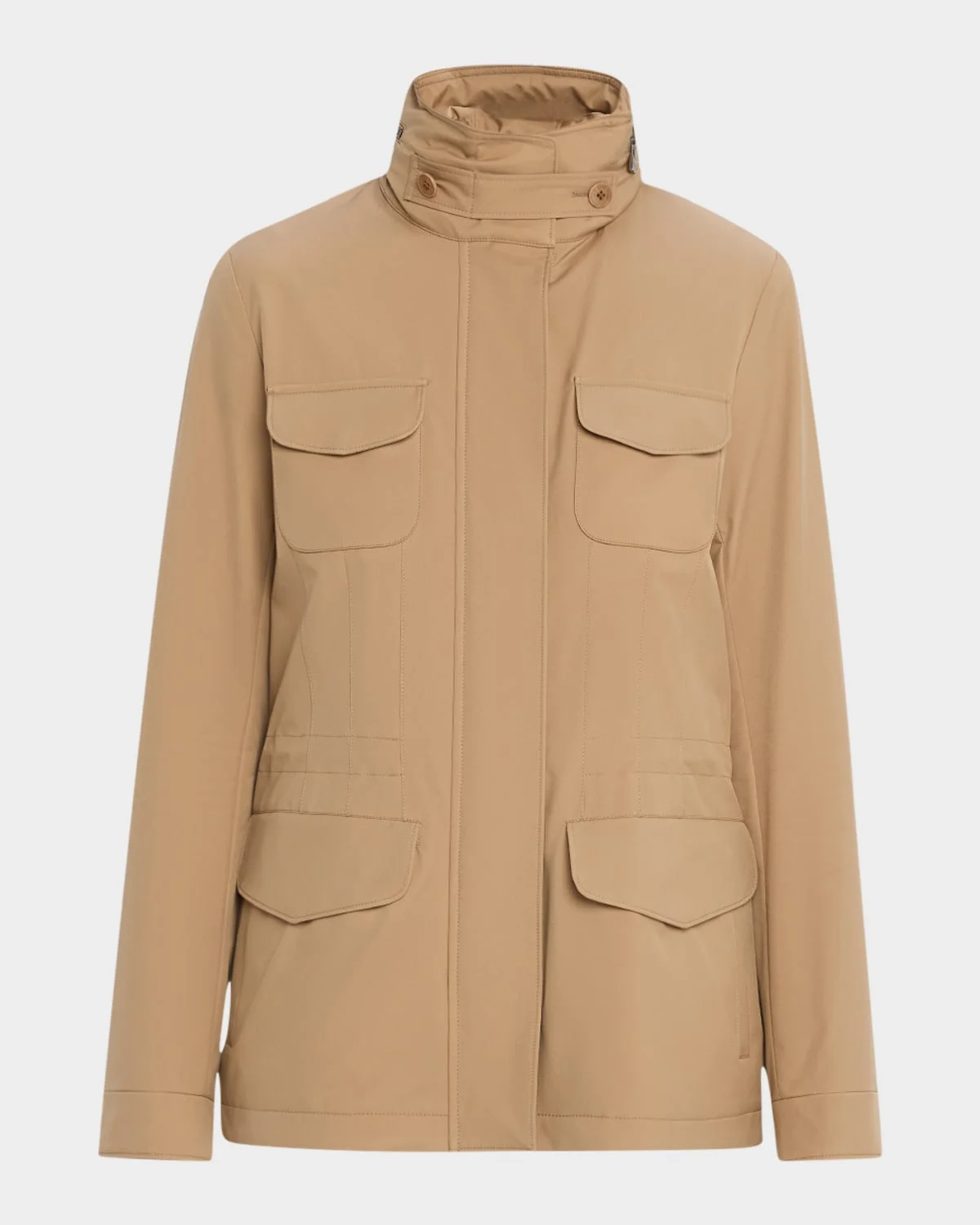 - Loro Piana "Traveller" lady field jacket in a windmate stretch storm fabrication with a zip-hidden hood - Stand collar with throat latch; concealed zip front - Long sleeves; snap-tab cuffs - Internal drawstring cinched waist - Hip flap pockets - Straight fit - Hip length - Cashmere/nylon/polyamide - Made in Italy