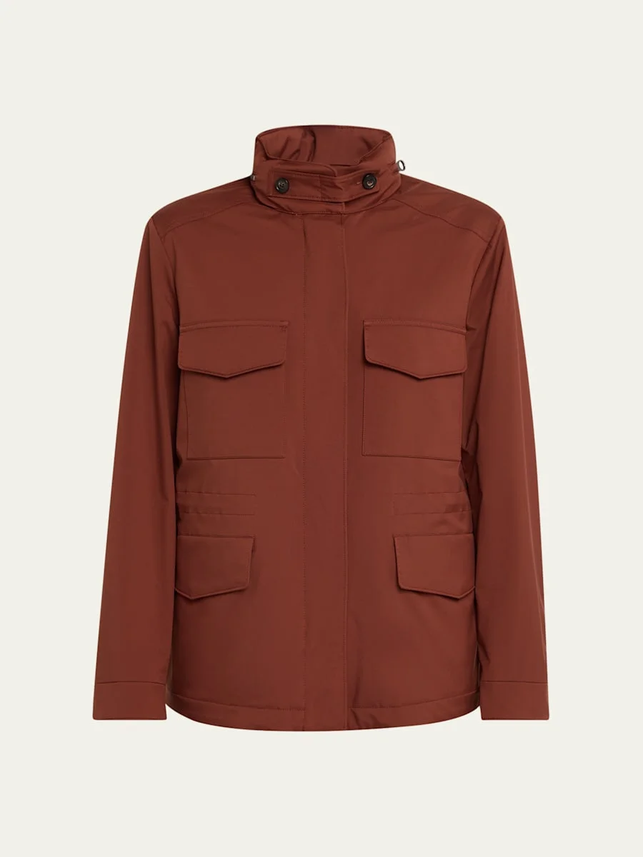 Loro Piana "Traveller" mini field jacket in lightweight, crease-resistant Windmate® microfiber and cashmere blend Storm System® treatment for a waterproof, wind-resistant finish Stand collar with throat latch Packable drawstring hood Zip front with concealed snap-over placket Long sleeves; snap-tab cuffs Internal drawstring waist Four front flap pockets Nylon/polyamide Lining: Cashmere Dry clean Made in Italy Proposition 65 warning for California residents Online Inquiries: BGS21_B9US7| Store Inquiries: #4974624