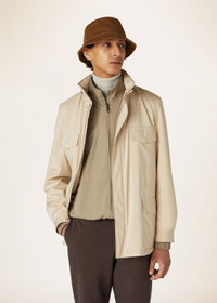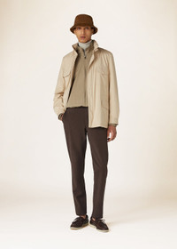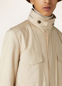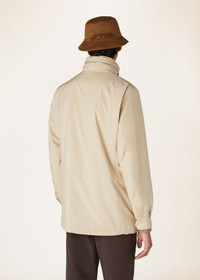 Modeled on the iconic men’s version and featuring proportions tailored to the female figure with a compact line, the Traveller Mini Field jacket is ideal for life on the go and reimagined here for the transition into the warmer months. It is rendered in Wind Stretch Storm System®, Loro Piana's classic microfiber that is feather-light and coated with a water-resistant finish. Completing the design on a functional note are multiple pockets that provide ample space for everyday essentials. Product details Standing collar with chin strap Removable stowaway hood Flap pockets with snap button at the chest; flap pockets with snap button; side entry pockets at the bottom Adjustable cuffs with snap buttons Front fastening with two-way zip and snap buttons Cashmere lining Regular fit Adjustable inner drawstring at the waist Composition: 100% Microfiber Made in Italy Product code: FAP9758