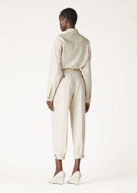 The Dylan pants are an exquisite blend of masculine and feminine elements, artfully framing the female silhouette with pristine, sculpted lines and subtle, refined nuances. Tailored from lightweight wool-silk, this peg design falls with refined elegance through wide, tapered legs that are gathered at the cuffs with a signature 'Sergio' horn button detail. A pre-shaped, logo-embossed waistband, concealed hook closure and rear pockets round off this beautiful piece. Product details Slit pockets on the sides lined in silk Fastens with Sergio buttons, a reworked design in refined horn in different shapes The new buttons are slightly thicker with a more rounded base to make them easier to fasten Composition: 84% Virgin Wool, 8% Silk, 6% Cotton, 2% Viscose Model wears an IT 36 Model measures: height 5′ 11″/ 180cm, bust 31.5″/ 80cm, waist 23.6″/ 60cm, hips 35.4″/ 90cm. Product code: FAO4743