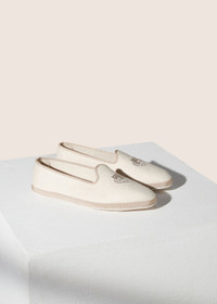 Cashmere slippers. This warm, comfortable style is finished with monochromatic grosgrain details and a small embroidered Loro Piana crest on the uppers. Product details Non-slip suede soles Composition: 93% Cashmere, 5% Silk, 2% Elastane Specific Features: 100% Suede Goatskin Product code: FAL9659