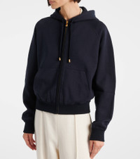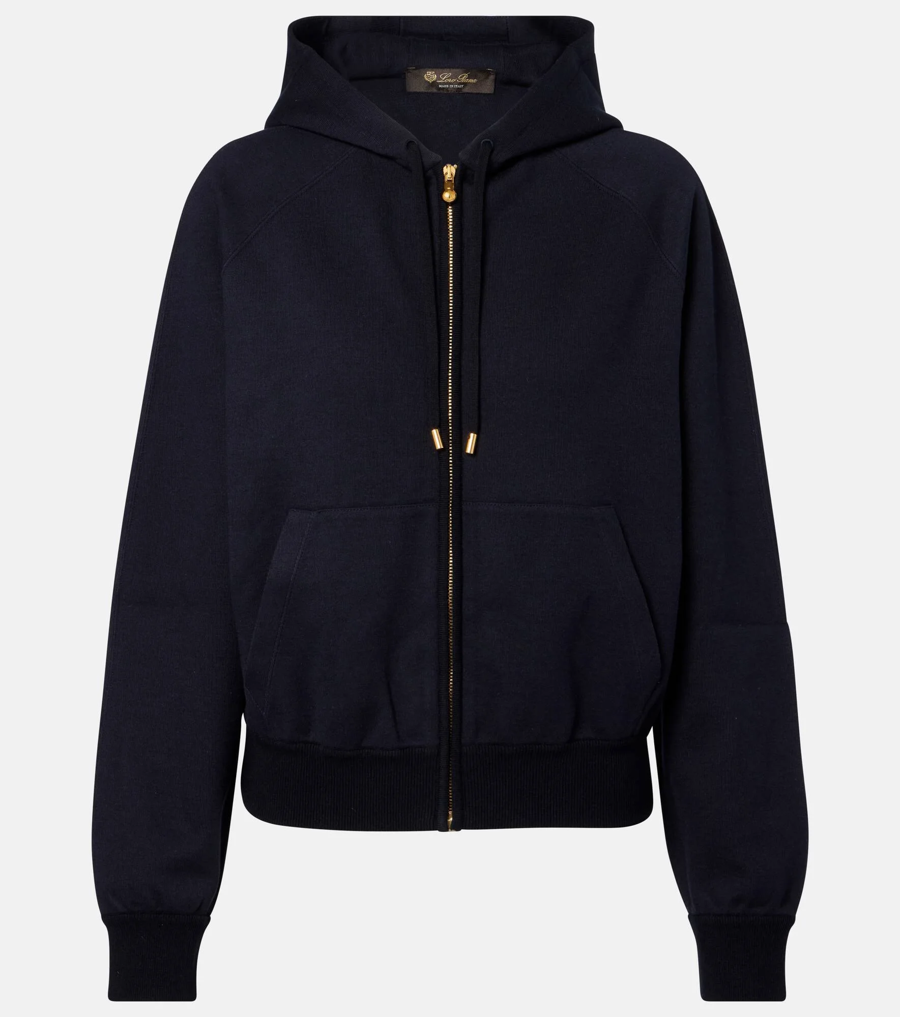 The Viera hoodie by Loro Piana is made from cotton, silk, and cashmere and perfectly embodies the brand's signature minimalism. Its design features a zipped front, kangaroo pockets and drawstrings for an adjustable fit. Product Details - Material: 51% cotton, 40% silk, 9% cashmere - Care instructions: dry clean - Made in Italy - Designer color name: Blue Navy - Item color: blue - Details: 77% cotton, 13% cashmere, 8% polyamide, 2% elastane - Closure: zipped front - Drawstring hood - Hardware color: gold - Pockets: slant pockets - Item number: P01069574 Size & Fit - True to size - Designed for a loose fit - Elasticated hem - Slightly stretchy fabric - Falls to the hip - The model seen in the picture is 178cm-5'10" and wearing a size XS