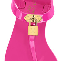 The Bikini flat sandal is a simple yet refined design in high-shine rubber. Its slender strap is accessorized with an LV-engraved padlock in gold-tone metal, a precious detail referencing Louis Vuitton leather goods. The sandal is adjusted at the back with a small, tonal buckle. Detailed Features - Magenta - Rubber - Rubber outsole - LV-engraved padlock - Made in Italy