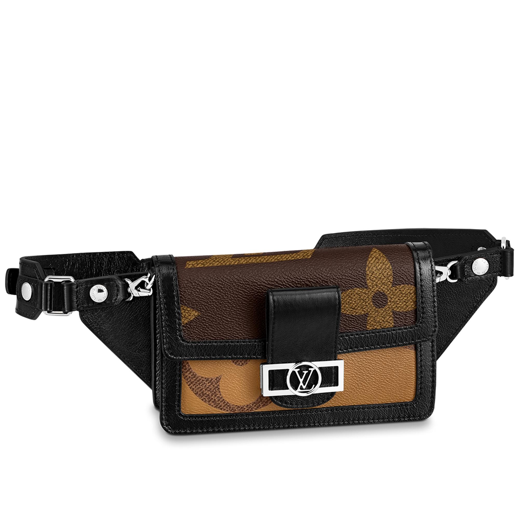 The Bumbag Dauphine combines Giant Monogram canvas with Giant Monogram Reverse canvas for a two-tone exploration of the iconic Monogram pattern. Its adjustable leather belt allows waist and cross-body wear while the removal of the strap turns it into a clutch. Detailed Features - Giant Monogram and Giant Monogram Reverse coated canvas - Calfskin-leather trim - Microfiber lining - Silver-color hardware - Removable leather belt (drop: min. 77.5 cm/30.5 inches, max. 92.5 cm/36.4 inches) - Large gusseted compartment - Large zipped pocket - Flat interior pocket - 4 card slots - Strap:Removable, adjustable - Strap drop: 30.5 inches - Strap drop max: 36.4 inches - The reference is either made in France, Spain, Italy or in the US. Length: 7.5 inches Height: 4.7 inches Width: 2 inches