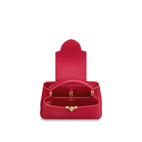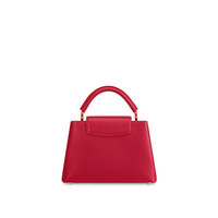 Fashioned from full-grain Taurillon leather, the now-classic Capucines BB handbag displays a host of House signatures: leather-wrapped LV Initials, jewel-like handle mounts inspired by historic trunks, and a distinctive flap with a Monogram Flower motif. Timelessly elegant, this charming model can be carried by hand or worn cross-body on its detachable strap. First launched in 2013, the Capucines is named for the Parisian street where Louis Vuitton first opened shop, in 1854. Detailed Features - Scarlet Red - Taurillon leather - Taurillon-leather trim - Cowhide-leather lining - Gold-color hardware - Snap hook to secure belongings - Double carry style: flap inside or outside - Compartmented interior with zipped pocket - 4 protective metal bottom studs - Strap:Removable, adjustable - Strap drop: 18.9 inches - Strap drop max: 20.9 inches - Handle:Single - The reference is either made in France, Spain, Italy or in the US. Length: 10.6 inches Height: 7.1 inches Width: 3.5 inches