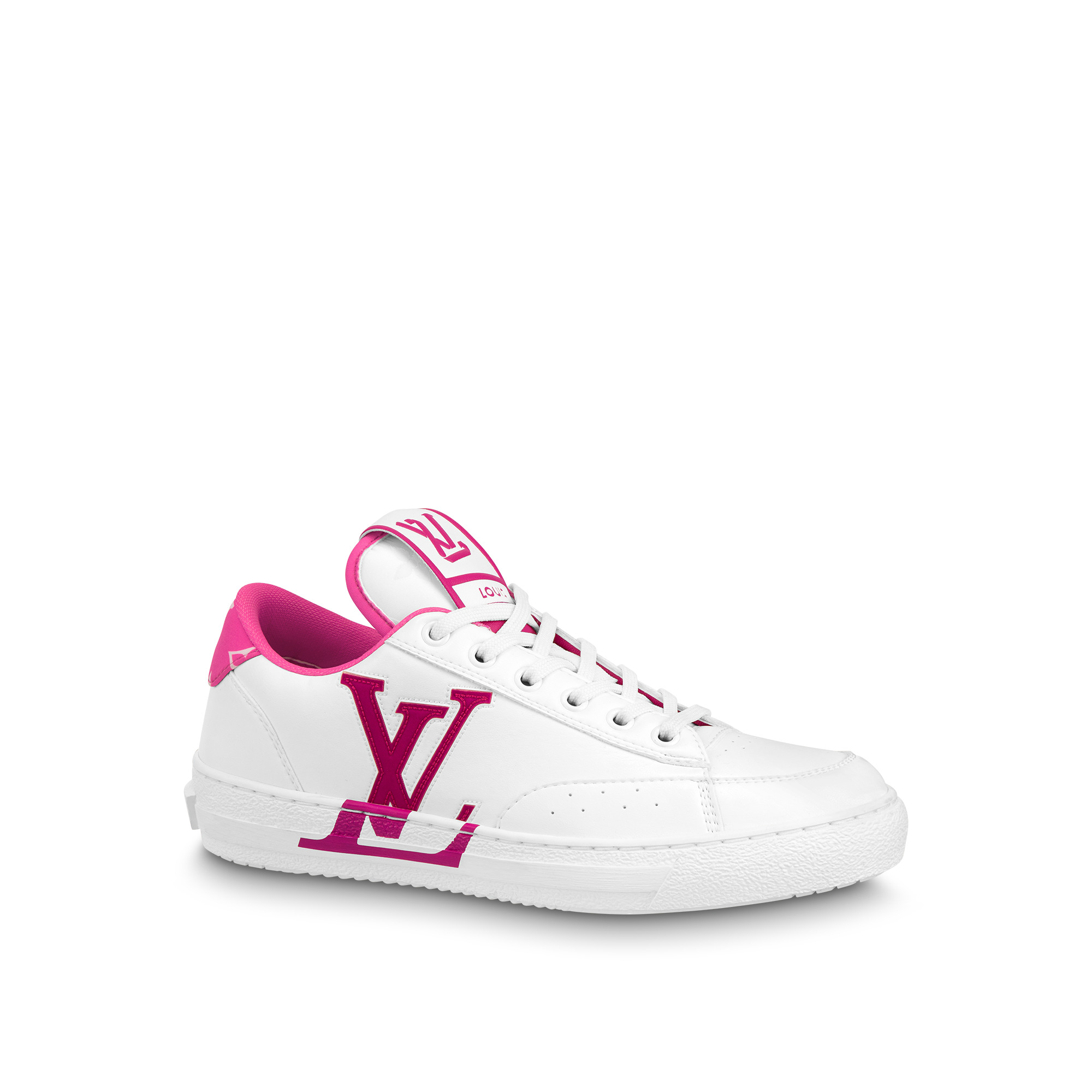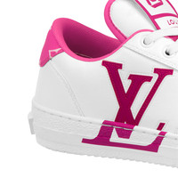 Louis Vuitton's first eco-designed shoe, and also its first unisex model, the Charlie sneaker is crafted from 90% sustainable materials, including recycled polyester laces and a recycled rubber outsole. The sleek design is highlighted by touches of color, as on the LV Initials on the side and the Monogram textile trim on the back. The tongue features the LV upcycling logo. Detailed Features - Magenta - Mix of sustainable materials - Upper made from recycled and bio-based sustainable materials - Recycled polyester laces - Recycled rubber outsole - LV Initials on the side - LV upcycling logo on the tongue - Monogram textile made with recycled polyester on the back - Louis Vuitton signature on the outsole - Monogram pattern on the tread - Made in Italy
