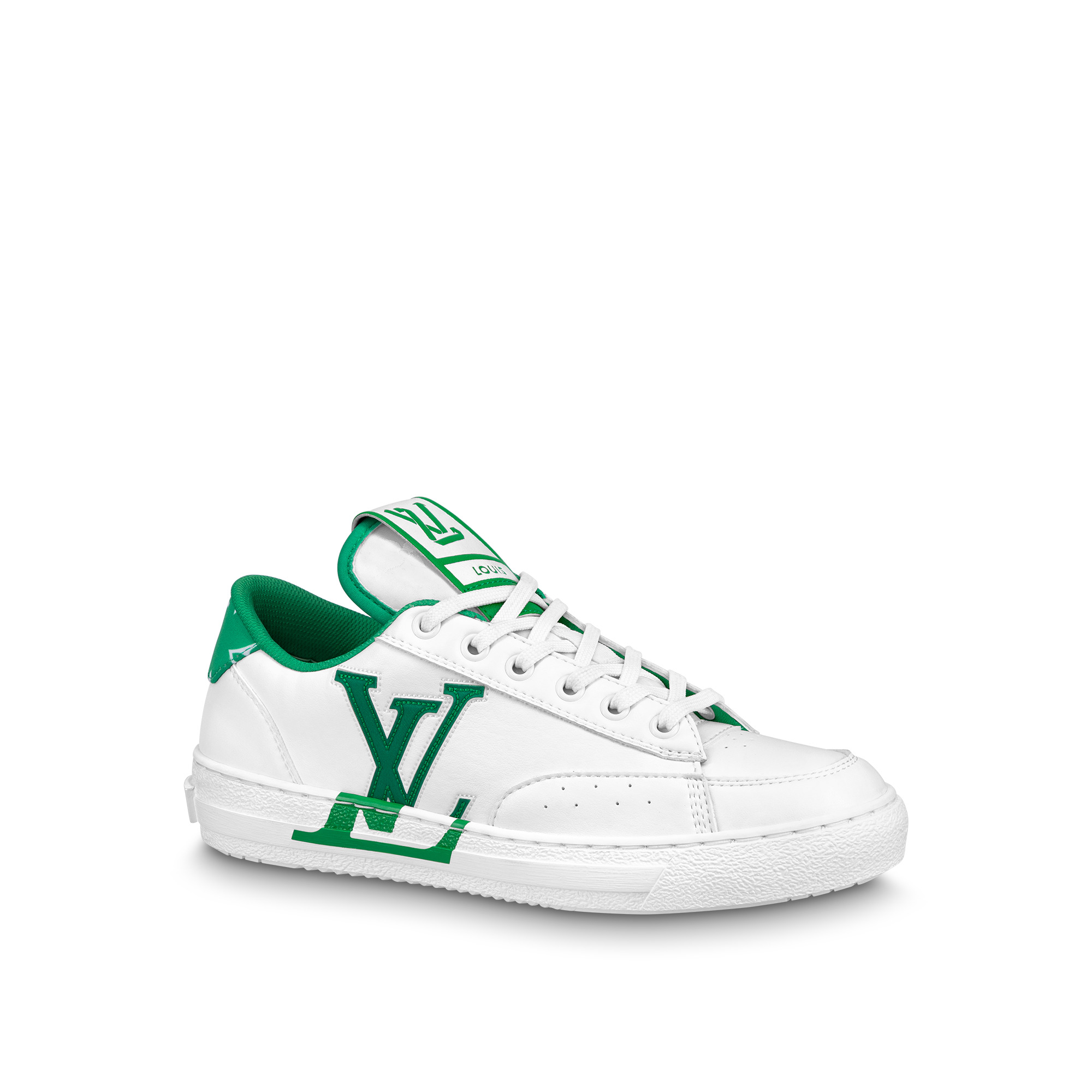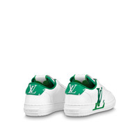 Louis Vuitton's first eco-designed shoe, and also its first unisex model, the Charlie sneaker is crafted from 90% sustainable materials, including recycled polyester laces and a recycled rubber outsole. The sleek design is highlighted by touches of color, as on the LV Initials on the side and the Monogram textile trim on the back. The tongue features the LV upcycling logo. Detailed Features - Green - Mix of sustainable materials - Upper made from recycled and bio-based sustainable materials - Recycled polyester laces - Recycled rubber outsole - LV Initials on the side - LV upcycling logo on the tongue - Monogram textile made with recycled polyester on the back - Louis Vuitton signature on the outsole - Monogram pattern on the tread - Made in Italy