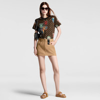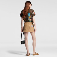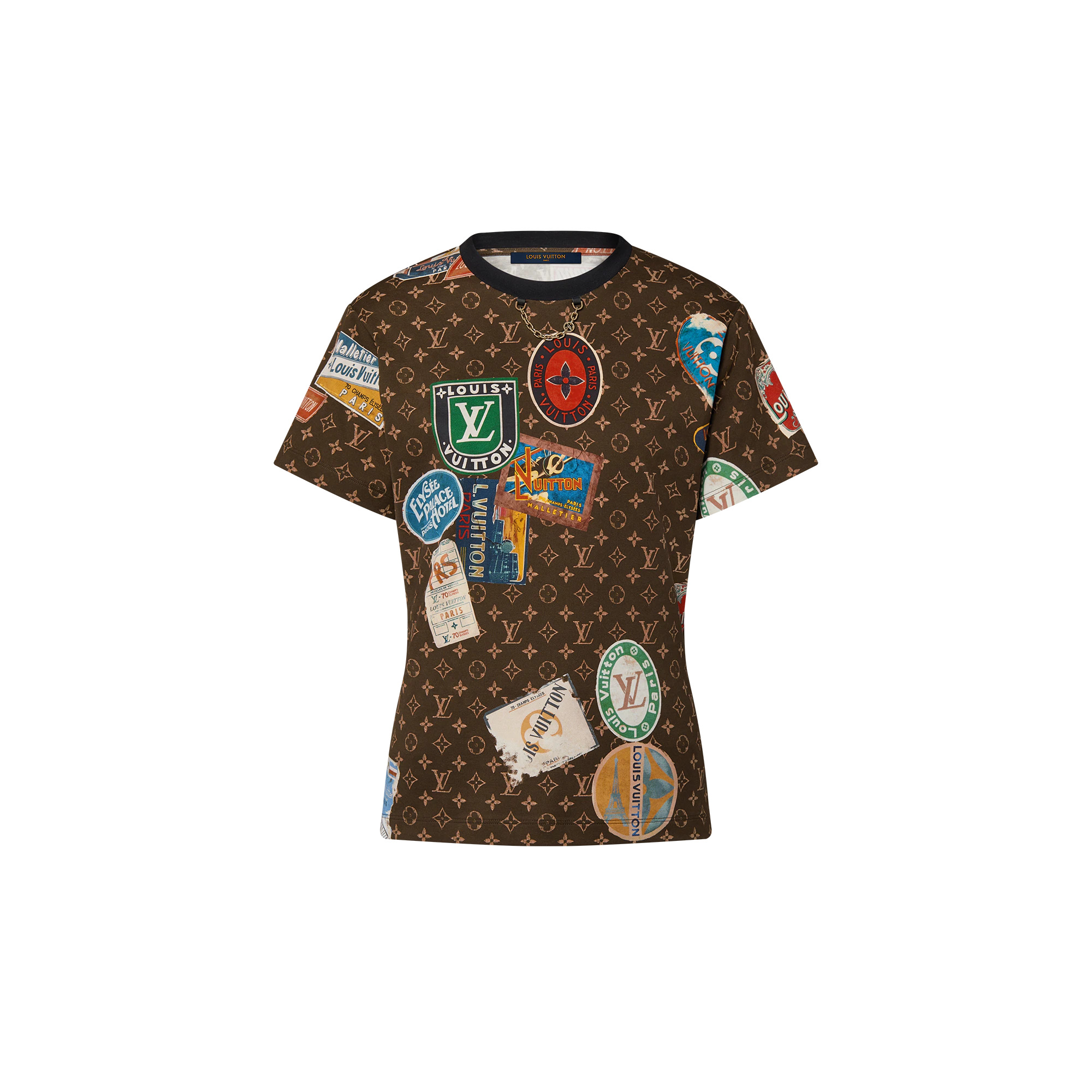 This cotton jersey T-shirt makes a bold signature statement in the Flight Mode capsule’s graphic Elysee Palace print, which twists a vintage-look Monogram motif with colorful Louis Vuitton travel stamps as a playful nod to the House’s heritage. The contrasting crew neckline is trimmed with an LV chain detail for a contemporary House touch. - Main Material : 100% Cotton - Dark Brown - Made in Italy