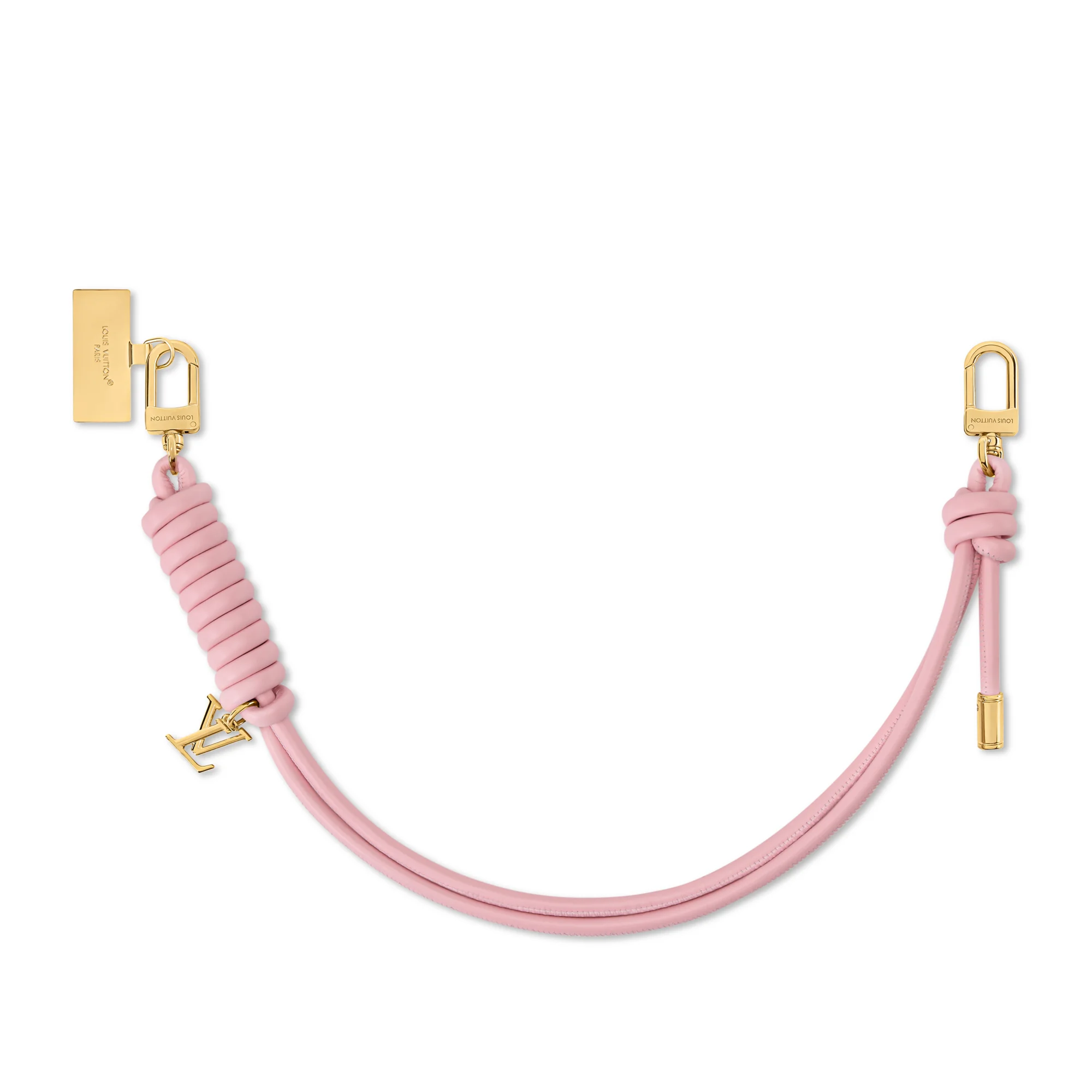 The on-trend Knot phone strap offers a clever combination of contemporary style and practical utility. Its colorful leather cord is accented with an LV Initials emblem and a Louis Vuitton Paris signature tether tab in gleaming gold-toned metal. Perfect for keeping a phone within easy reach, this handy strap can also be worn as an elegant bag charm. - Pink - Leather - Gold-toned hardware - Signature details - Dual Louis Vuitton signature snap hooks - Dual function as phone strap and bag charm