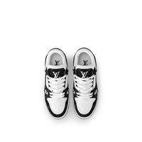 For the first time, the cult LV Trainer sneaker, a staple of the men's collection, is revisited for women in calf leather and Monogram denim. This classic design, created by Virgil Abloh, references vintage basketball sneakers. It features numerous signature details, including the LV Initials on the tongue and side, and Monogram Flowers on the outsole. - Black - Calf leather and Monogram denim - Rubber outsole - LV Initials on the tongue, side and back - Vuitton signature on the side - Monogram Flowers on the outsole - Made in Italy