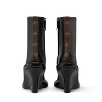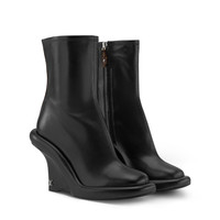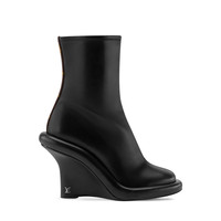 One of the standout styles at the Louis Vuitton Fall-Winter 2025 women's show, the Lounge wedge ankle boot is crafted from soft lambskin. This striking design was inspired by avant-garde furniture in luxurious materials. It features Monogram-canvas trim at the back and an LV Initials stud on the sculptural wedge heel, which is also covered in lambskin. - Black - Lambskin - Back zip - Signature details - Leather outsole - Wedge heel, 9cm/3.5 inch - Made in Italy