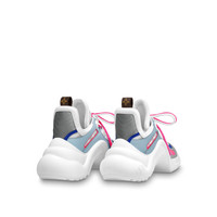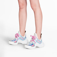 This seasonal interpretation of the iconic LV Archlight sneaker comes in leather and technical fabric with a Monogram print. Flashes of pop color complement this futuristic design, whose key features are an oversized tongue, low cut around the ankle and turbo outsole. It is finished with a back loop in Monogram canvas. Detailed Features - Leather and technical fabrics - Blue - Oversized rubber outsole (5 cm / 2 inches) - Made in Italy