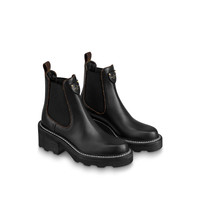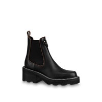 The LV Beaubourg ankle boot in black calf leather mixes masculine and feminine codes. The upper, which was inspired by Chelsea boots, is combined with a chunky yet lightweight outsole. This model features refined details, including Monogram-canvas piping around the elastic side panels and white stitching around the welt. Detailed Features - Black - Calf leather - Elastic side panels - Leather and micro outsole - 4 cm / 1.6-inch heel - Louis Vuitton-embossed patch - Monogram-canvas back loop - Made in Italy