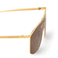 These LV Golden Mask sunglasses are a true testament to Maison craftsmanship. The new design from the Fall-Winter 2022 collection pairs an architectural silhouette with slender temples for an elegant look and lightweight feel. On the front, the 5 Elements signature presents itself through enamel filled studs that perfectly match the color of the lenses. Detailed Features - Gold-toned metal frame - Brown lens - Mask shape - Gold-toned 5 Elements studs on lens - Engraved Monogram Flowers on end tips - Engraved Louis Vuitton signature on temples - Transmittance:15% - UV Protection:100% - Filter Category:3
