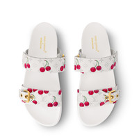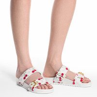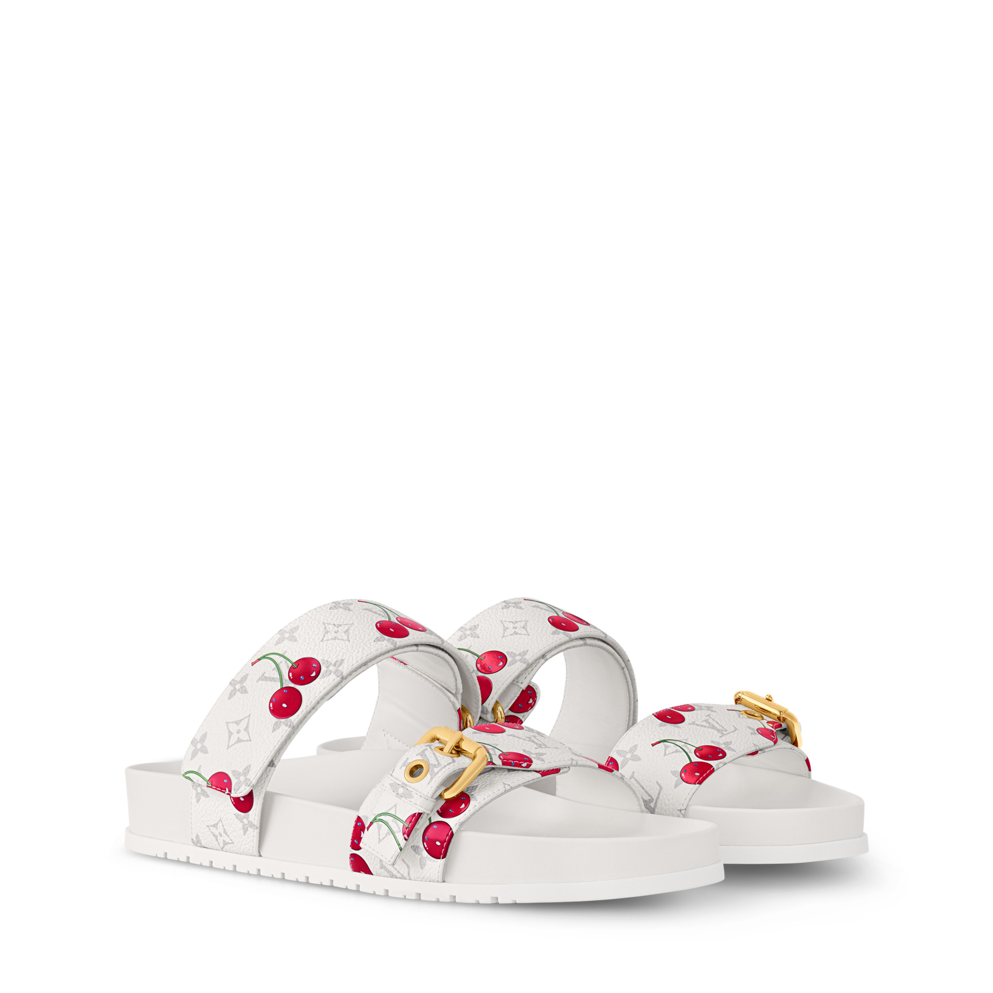 The House’s classic Bom Dia flat comfort mule is playfully uplifted in Monogram cherry canvas in fresh seasonal tones as part of the exclusive re-edition of the Louis Vuitton x Takashi Murakami collection. The top strap is adjusted with velcro, while the lower one is fastened with a chic gold-tone buckle. This casual style is complete with an anatomic insole and slip-resistant outsole. - Monogram cherry coated canvas - Gold-toned hardware - Adjustable velcro strap and buckle strap - Signature engraving and tread pattern - Anatomic insole - Treaded rubber outsole - Made in Italy