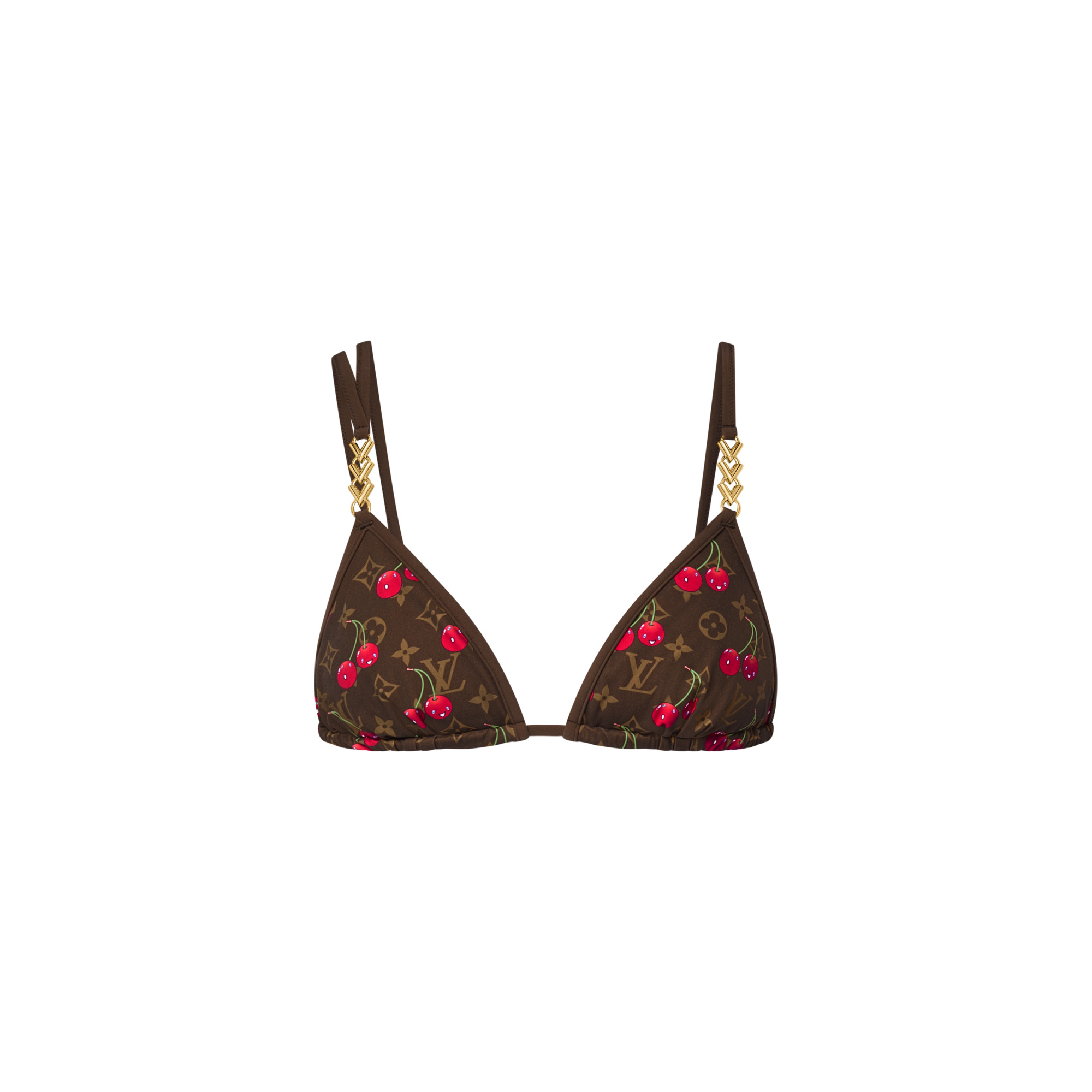 This classic triangle bikini top is uplifted with a playful signature from the re-edition of the coveted Louis Vuitton x Takashi Murakami collection. Cut from swimwear jersey, the print twists the House’s emblematic Monogram with cherry motifs in the artist’s vibrant aesthetic. The slim straps are trimmed with triple-V hardware for a final House touch. - Main Material : 58% Polyamide, 42% Elastane - Havana - Made in Italy