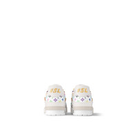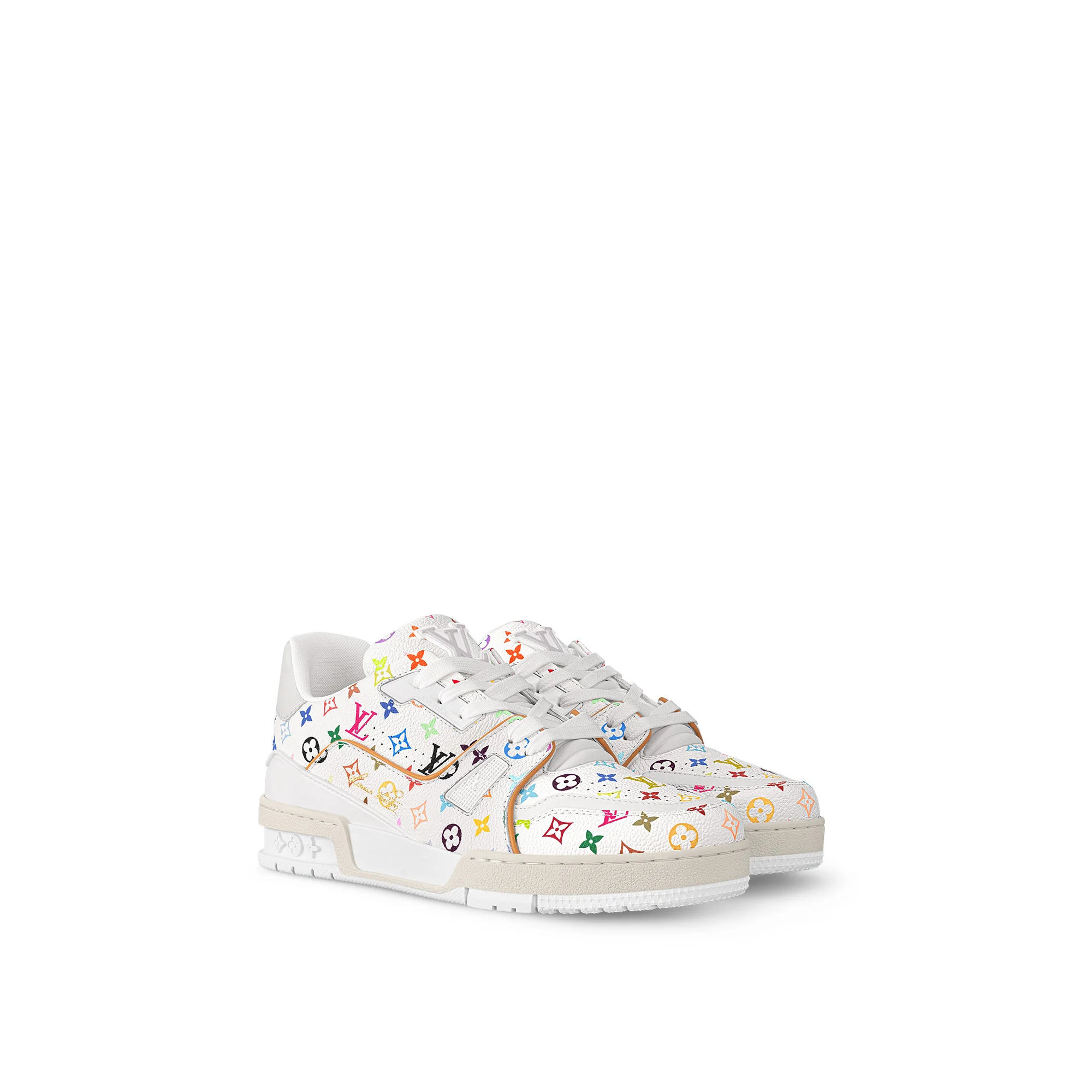 The iconic LV Trainer sneaker makes a fresh statement in grained calf leather featuring an allover print of a multicolored Monogram motif from the re-edition of the Louis Vuitton x Murakami collection, inspired by the artist’s exuberant aesthetic. Informed by vintage sporty styles, the upper is detailed with a cursive Louis Vuitton signature, while the back is printed with the number 54 in reference to 1854, the year the House was founded. - Multicolored - Grained calf leather - Laces - Signature prints - 7 hours of stitching for one pair - Rubber outsole with Monogram Flowers - Made in Italy
