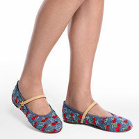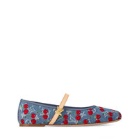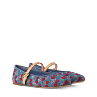 As part of the celebratory second edition of the Louis Vuitton x Takashi Murakami collection, the classic Romy flat ballerina pump makes a fresh everyday statement in Monogram denim detailed with luscious cherries embroidered over the top. The slim strap strikes a contrast in the House’s emblematic natural leather, fastened with a chic gold-toned LV Twist charm. - Monogram cherry denim - Leather outsole - Gold-toned hardware - Strap fastening - Signature accessory - Made in Italy - This style runs large. It is recommended to order a half-size smaller than usual.