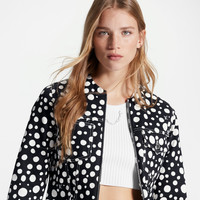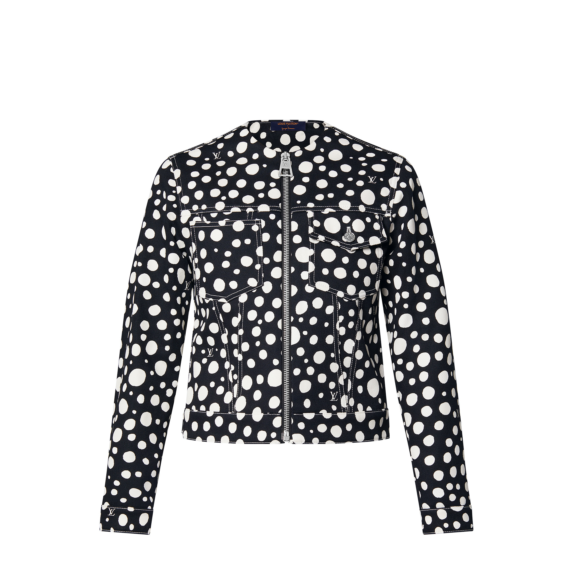 An allover print of the Louis Vuitton x Yayoi Kusama capsule’s playful Infinity Dots elevates this chic gabardine jacket into a graphic everyday statement. The casual cut is finished with a clean neckline and a contemporary exposed zipper fastening, which is trimmed with an oversized LV pull. Asymmetrical pockets add a functional detail to the front, while contrast stitching nods to classic denim pieces. Detailed Features - Main Material : 100% Cotton - Black and White - Regular fit - Made in Italy